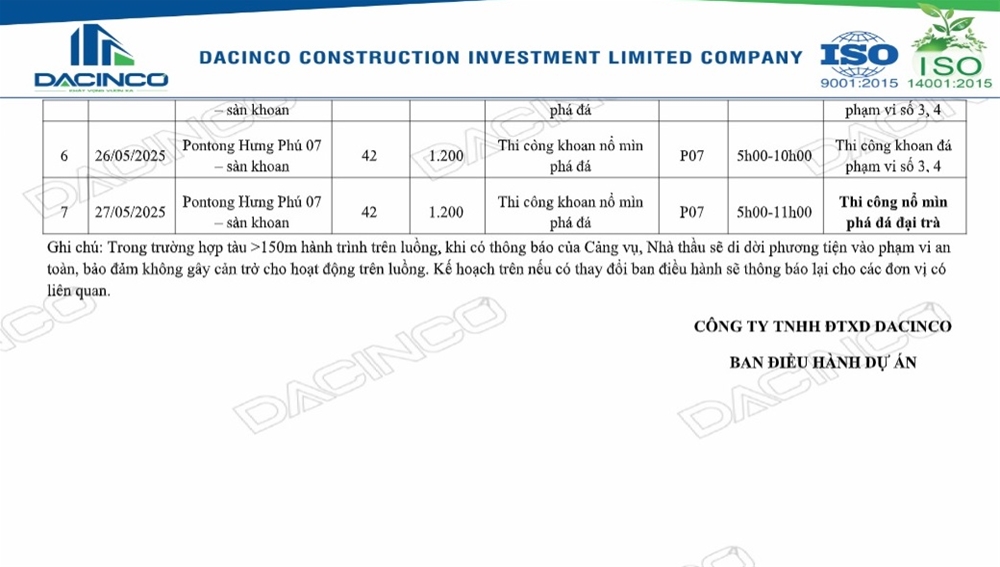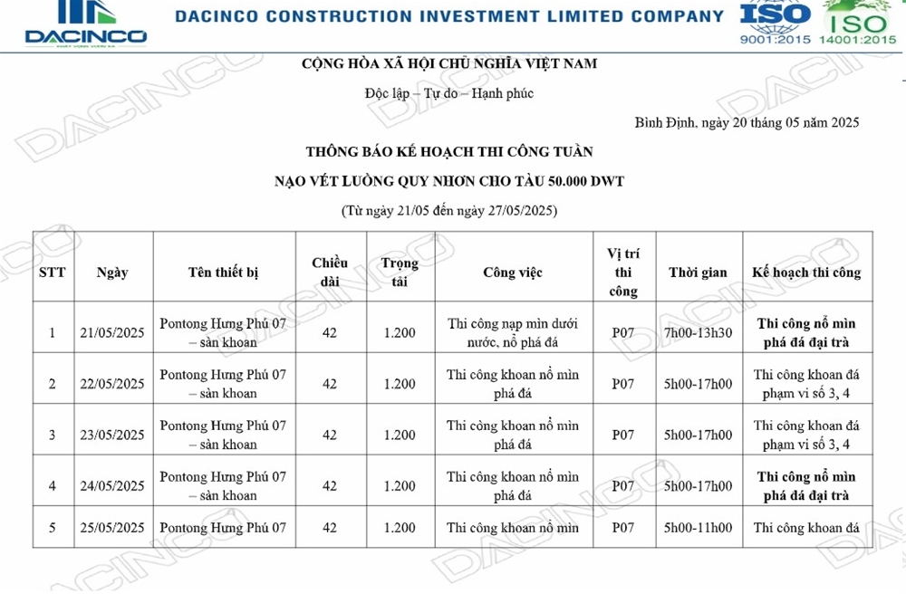 KẾ HOẠCH THI CÔNG CTY DACINCO TỪ NGÀY 21.05.2025 -27.05.2025