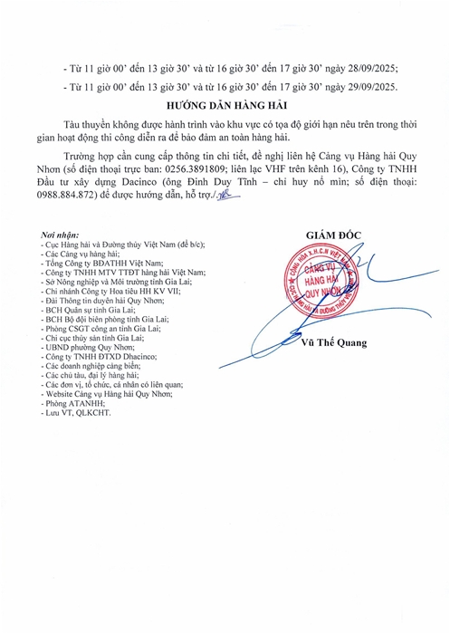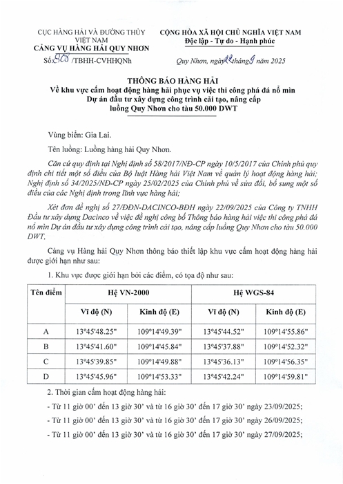 THÔNG BÁO HÀNG HẢI Về thông số kỹ thuật độ sâu của luồng hàng hải Quy Nhơn