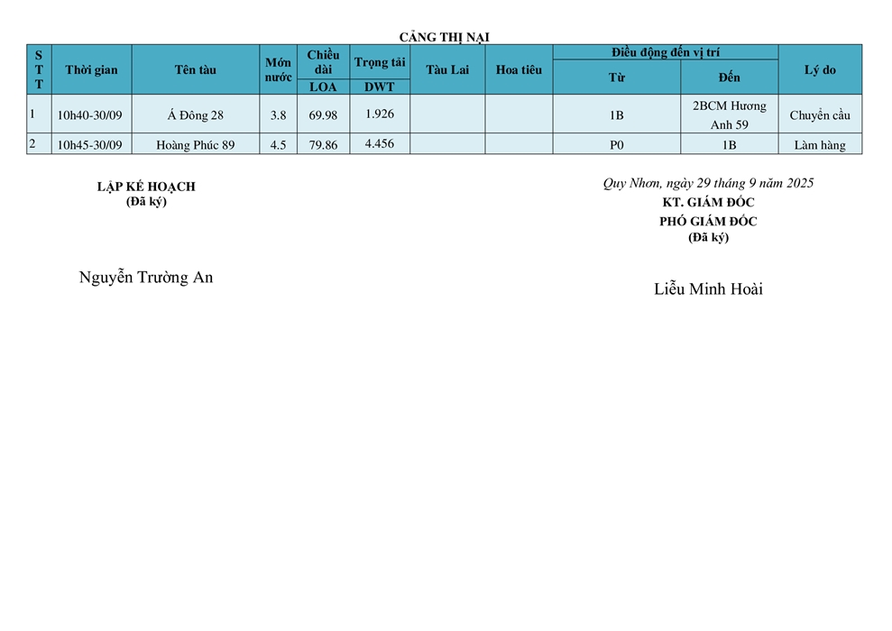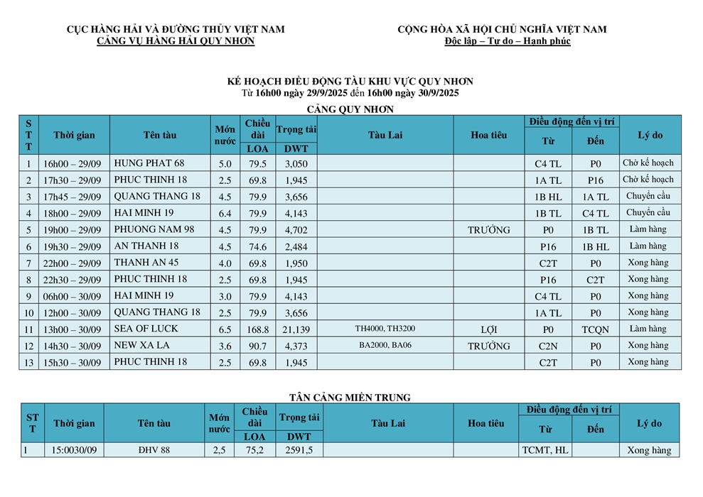 KẾ HOẠCH ĐIỀU ĐỘNG TÀU NGÀY 30/09/2025