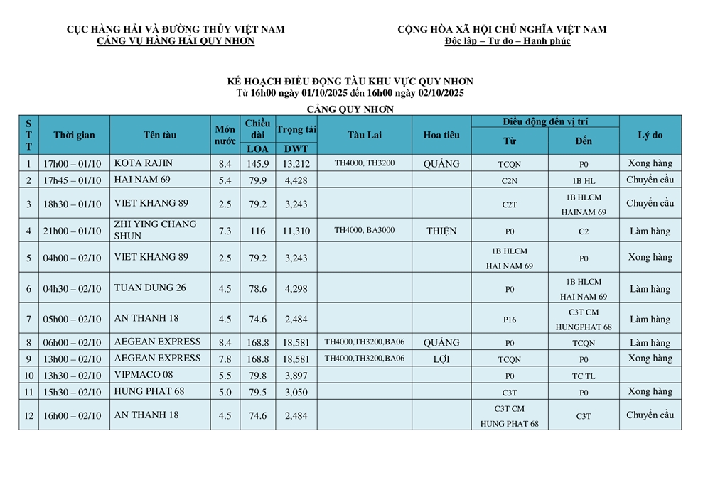 KẾ HOẠCH ĐIỀU ĐỘNG TÀU NGÀY 02/10/2025
