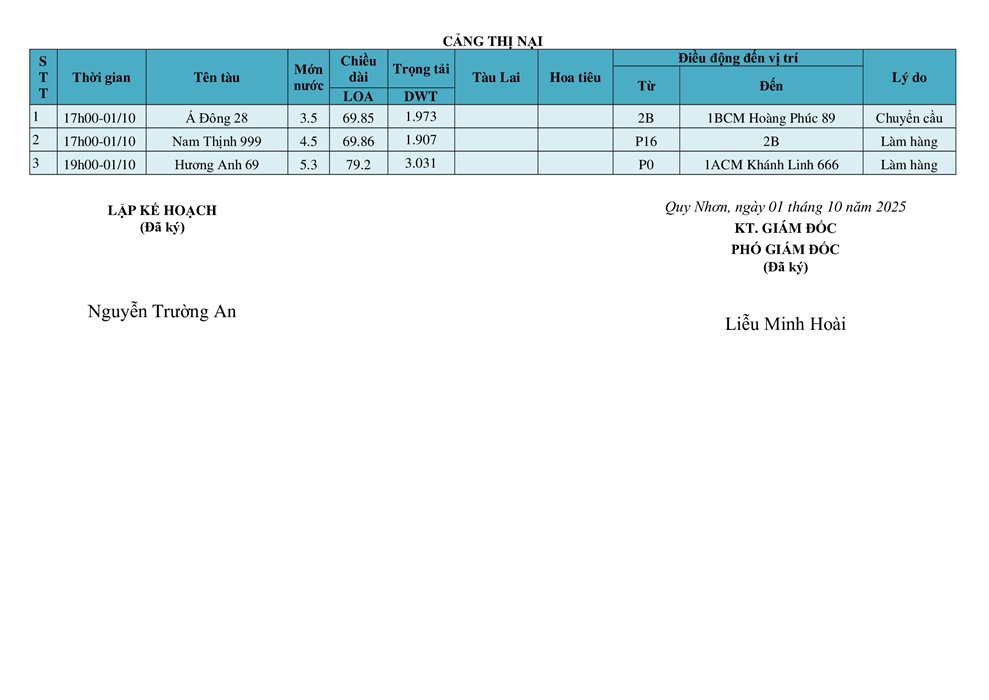 KẾ HOẠCH ĐIỀU ĐỘNG TÀU NGÀY 03/10/2025