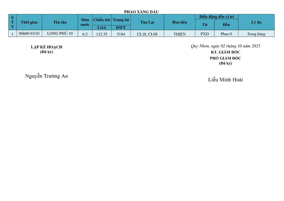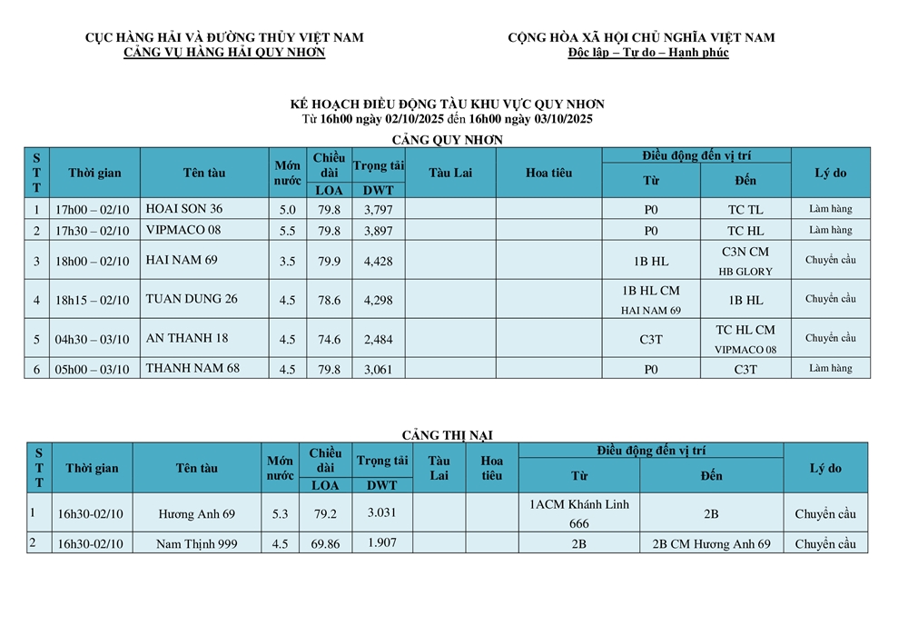KẾ HOẠCH ĐIỀU ĐỘNG TÀU NGÀY 02/10/2025