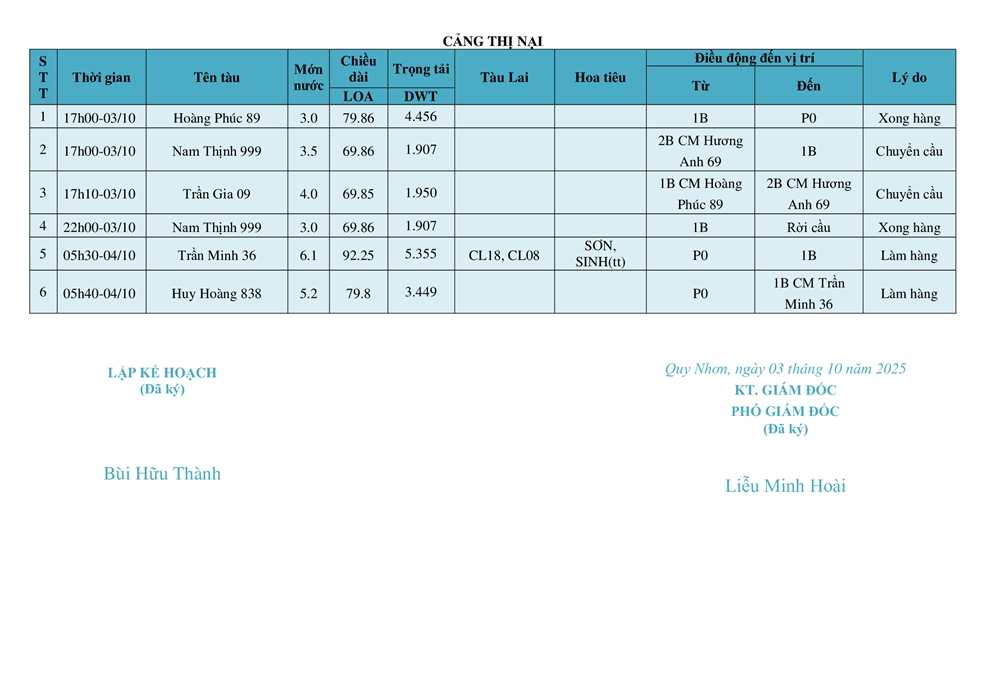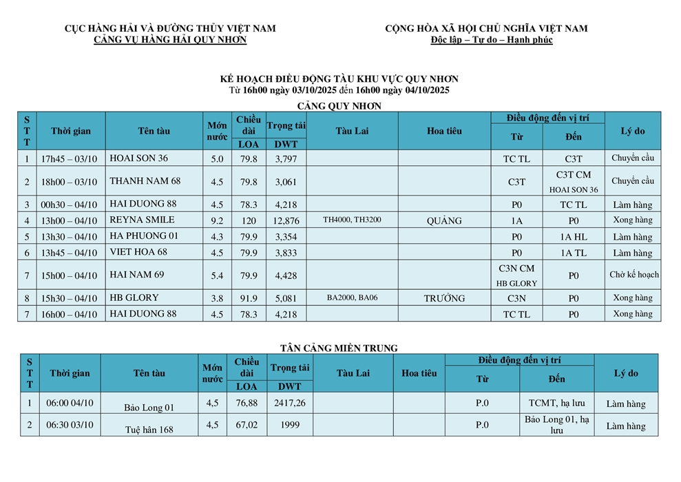 KẾ HOẠCH ĐIỀU ĐỘNG TÀU NGÀY 03/10/2025