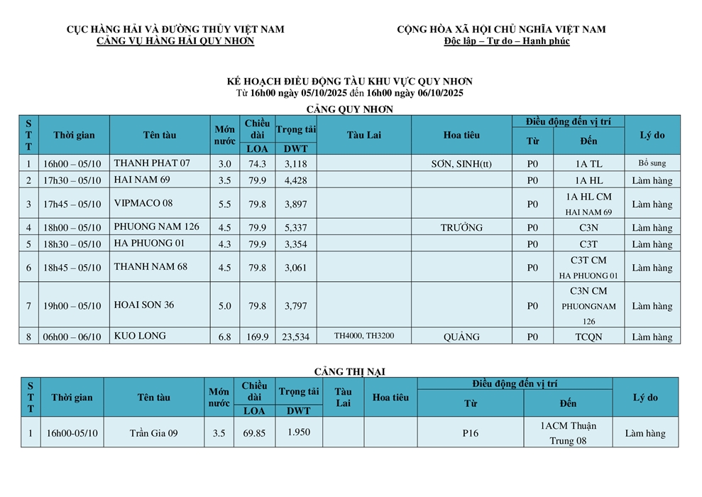 KẾ HOẠCH ĐIỀU ĐỘNG TÀU NGÀY 05/10/2025