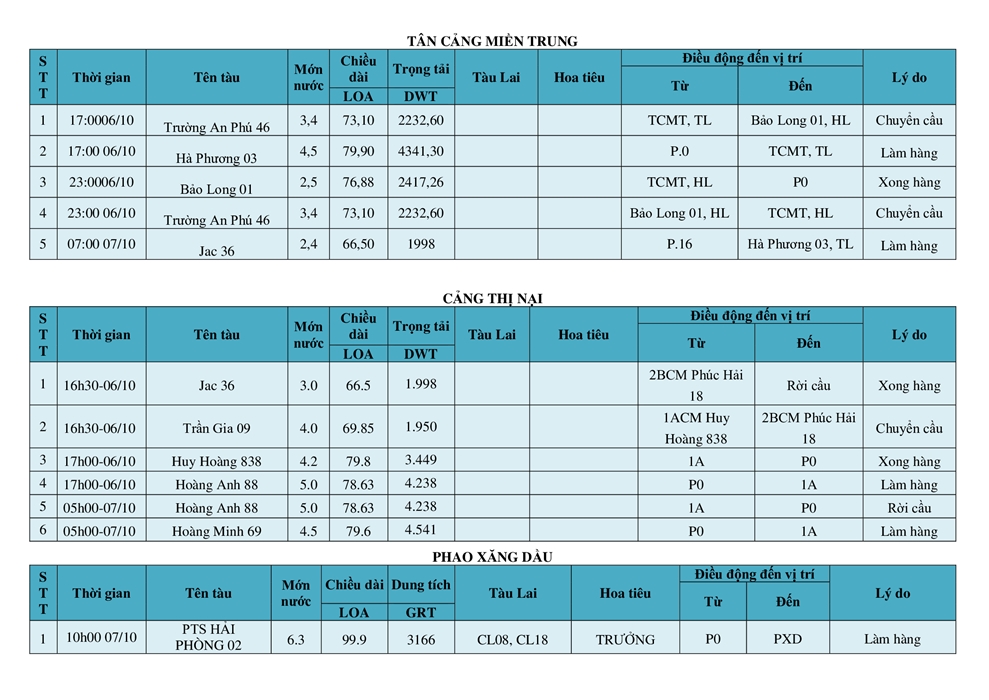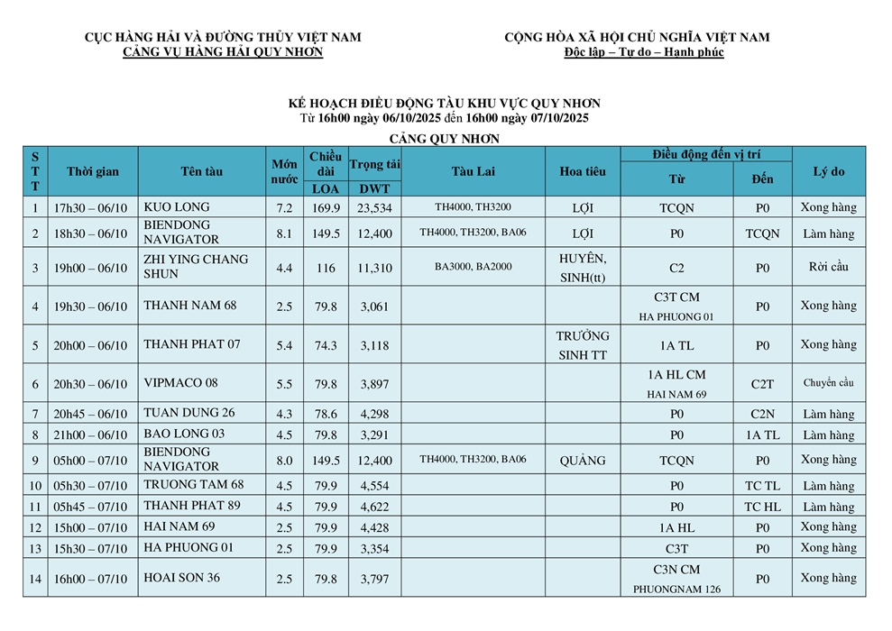 KẾ HOẠCH ĐIỀU ĐỘNG TÀU NGÀY 06/10/2025
