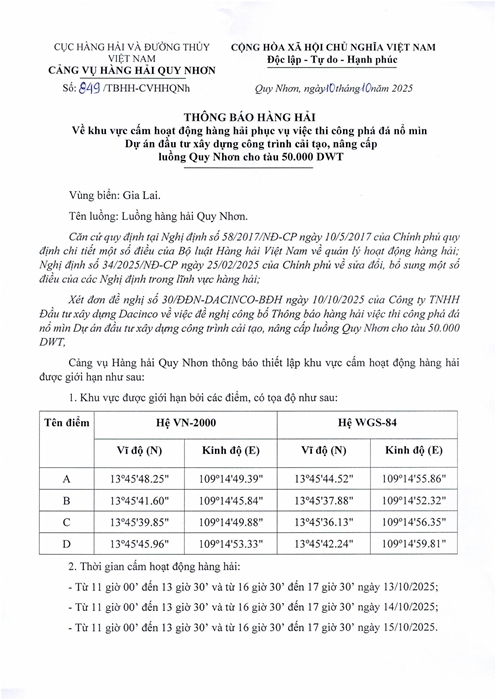 Thông báo hàng hải khu vực cấm hoạt động hàng hải
