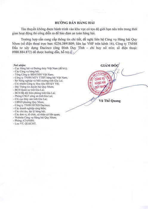 THÔNG BÁO HÀNG HẢI Về thông số kỹ thuật độ sâu của khu nước trước bến, khu nước ra luồng Bến cảng Quân sự Quy Nhơn ( Tân cảng miền trung)