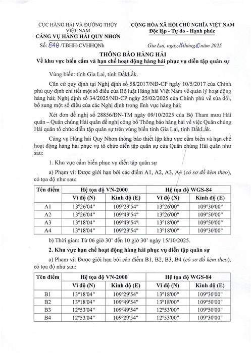 Thông báo hàng hải khu vực cấm biển và hạn chế hoạt động hàng hải phục vụ Diễn tập quân sự của Quân chủng Hải quân