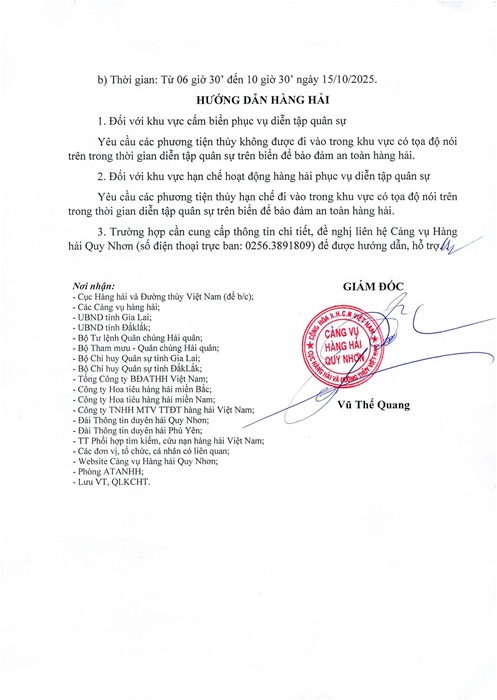 THÔNG BÁO HÀNG HẢI Về thông số kỹ thuật độ sâu của khu nước trước bến, khu nước ra luồng Bến cảng Quân sự Quy Nhơn ( Tân cảng miền trung)