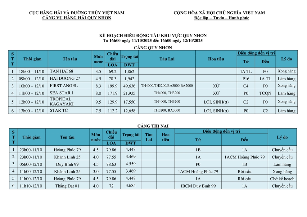 KẾ HOẠCH ĐIỀU ĐỘNG TÀU NGÀY 12/10/2025