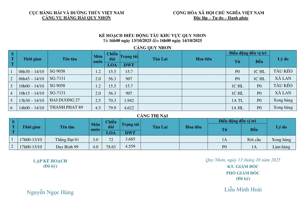 KẾ HOẠCH ĐIỀU ĐỘNG TÀU NGÀY 13/10/2025