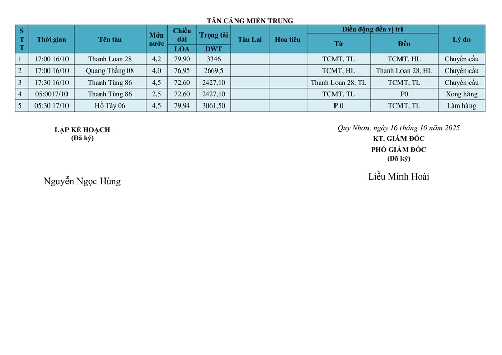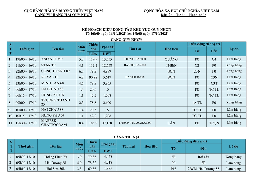 KẾ HOẠCH ĐIỀU ĐỘNG TÀU NGÀY 16/10/2025
