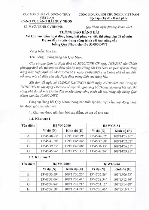 THÔNG BÁO HÀNG HẢI Về thông số kỹ thuật độ sâu của luồng hàng hải Quy Nhơn