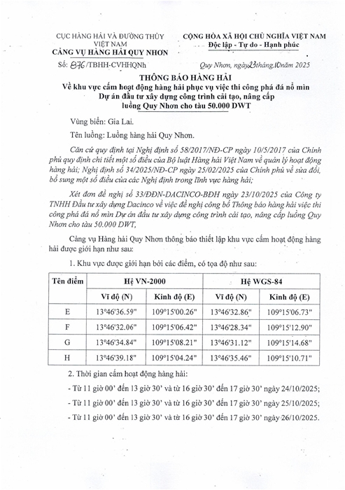Thông báo hàng hải khu vực cấm hoạt động hàng hải