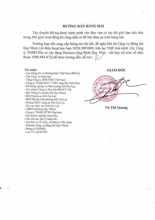 Về việc điều chỉnh vị trí phao báo hiệu hàng hải số “0", “3", “3A", “5" và “10” luồng hàng hải Quy Nhon
