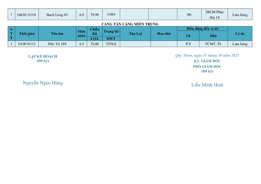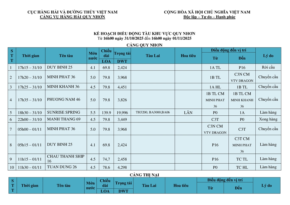 KẾ HOẠCH ĐIỀU ĐỘNG TÀU NGÀY 31/10/2025