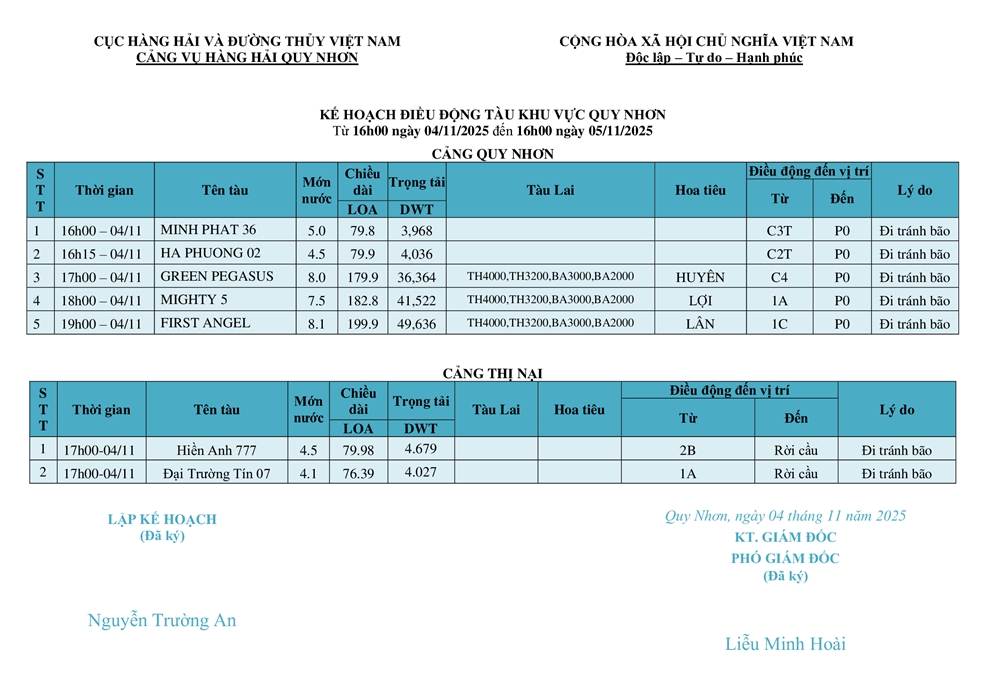 KẾ HOẠCH ĐIỀU ĐỘNG TÀU NGÀY 05/11/2025