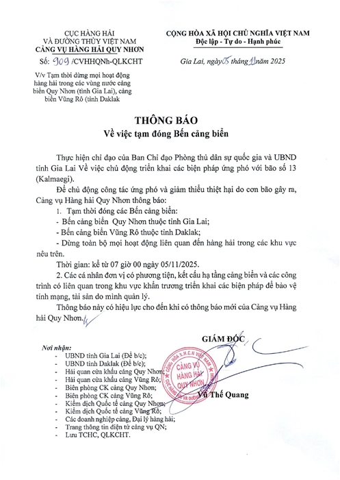THÔNG BÁO Về việc tạm đóng Bến cảng biển