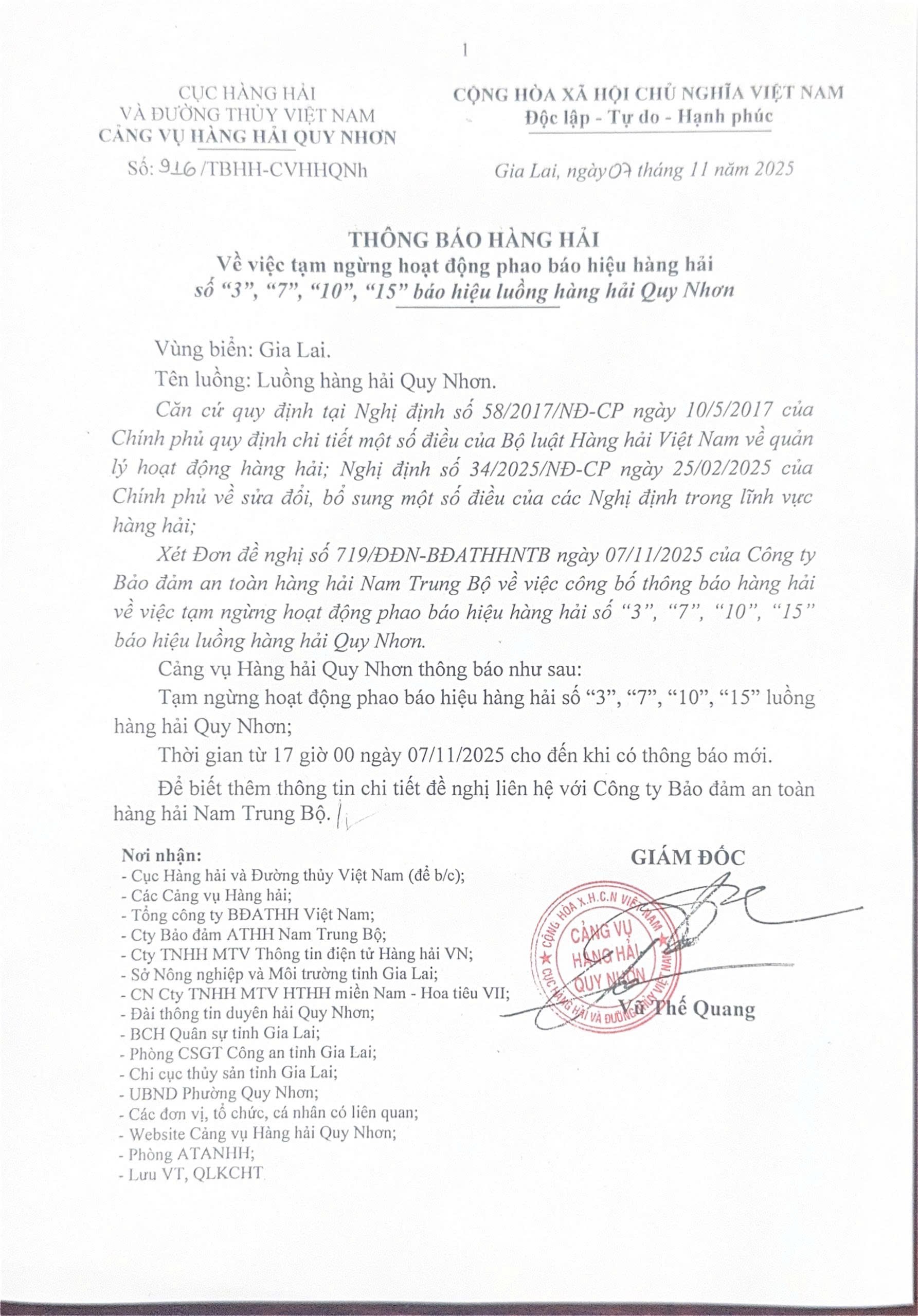 Thông báo hàng hải về tạm dừng hoạt động phao báo hiệu hàng hải số 03, 07, 10, 15 báo hiệu hàng hải luồng Quy Nhơn