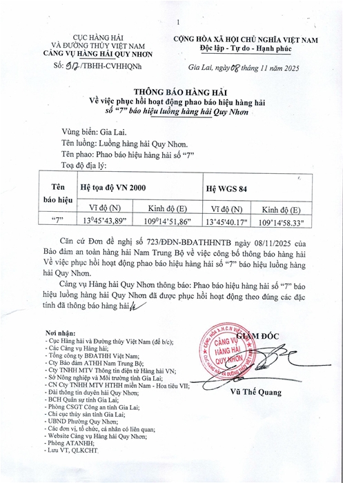 Thông báo hàng hải về việc phục hồi hoạt động phao báo hiệu hàng hải số “7” báo hiệu luồng hàng hải Quy Nhơn