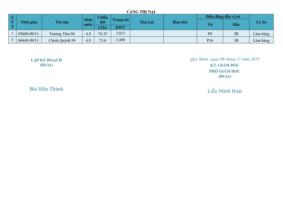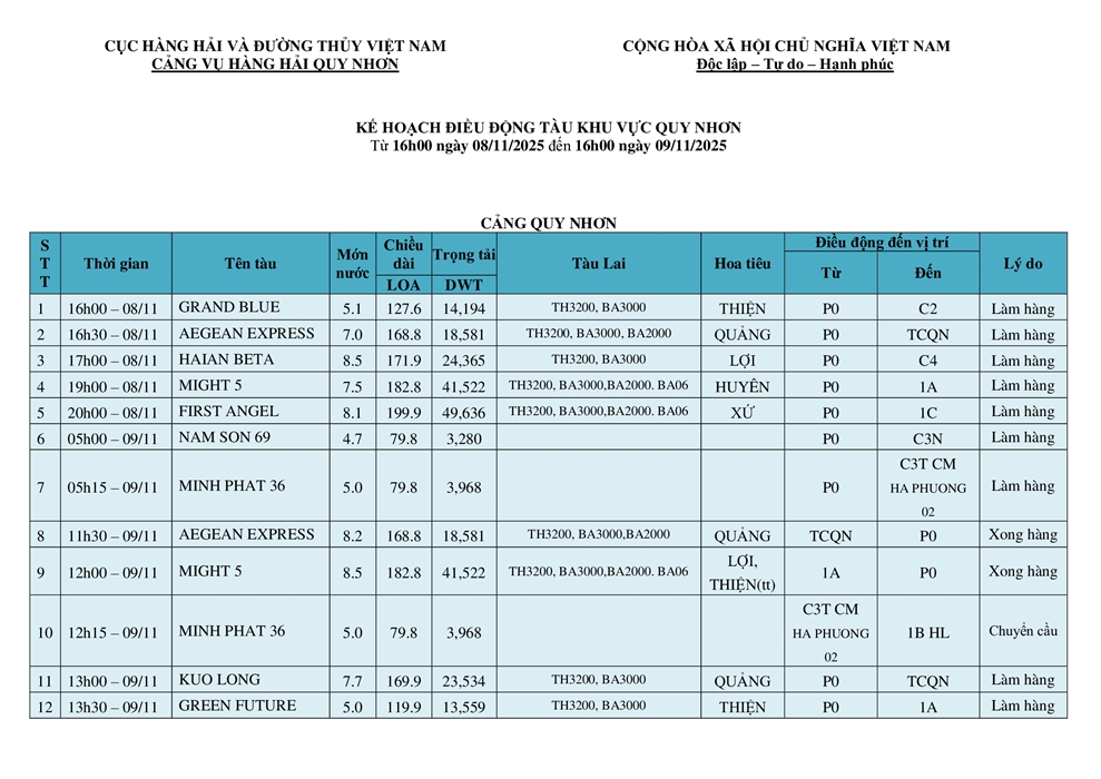 KẾ HOẠCH ĐIỀU ĐỘNG TÀU NGÀY 09/11/2025
