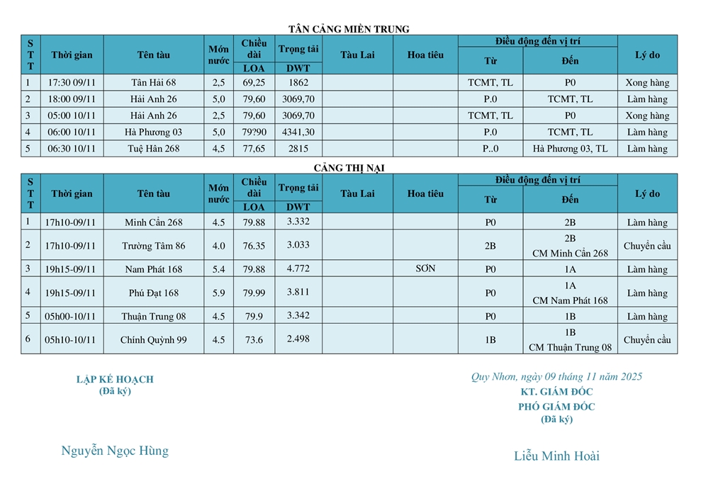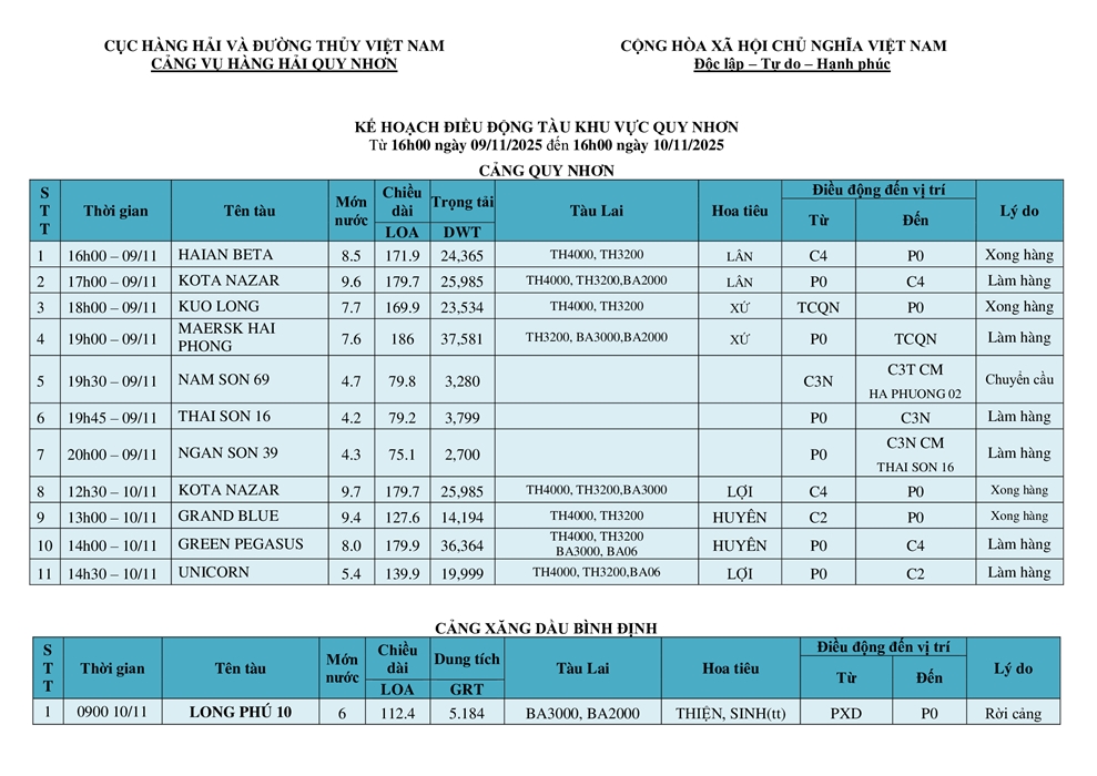 KẾ HOẠCH ĐIỀU ĐỘNG TÀU NGÀY 10/11/2025