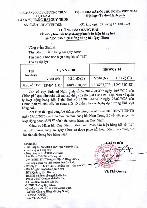 Thông báo hàng hải về việc phục hồi hoạt động phao báo hiệu hàng hải số “15” báo hiệu luồng hàng hải Quy Nhơn