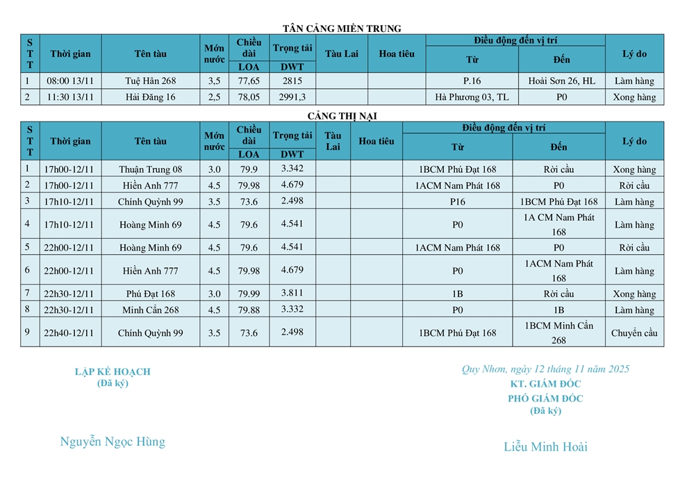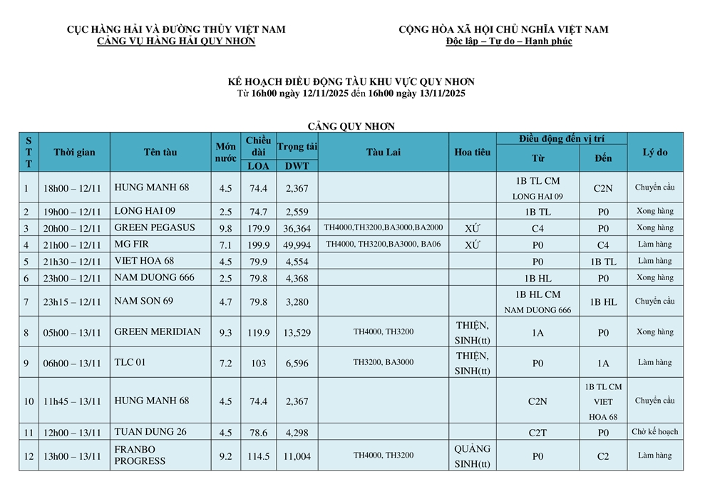 KẾ HOẠCH ĐIỀU ĐỘNG TÀU NGÀY 13/11/2025