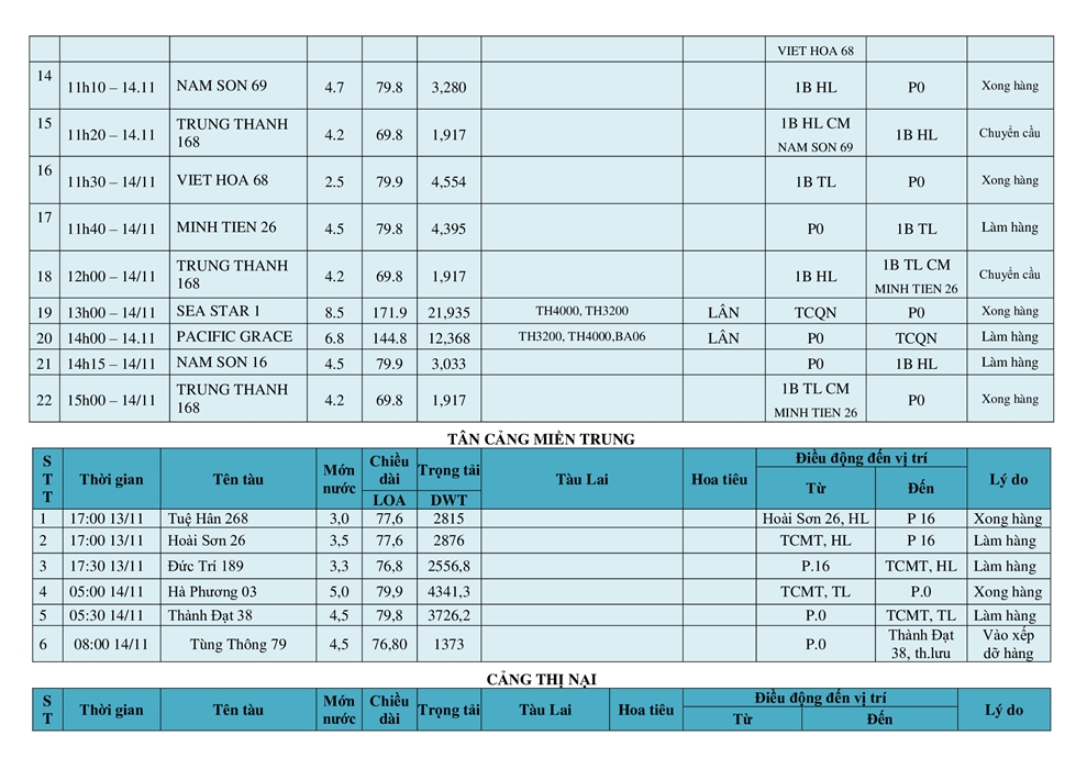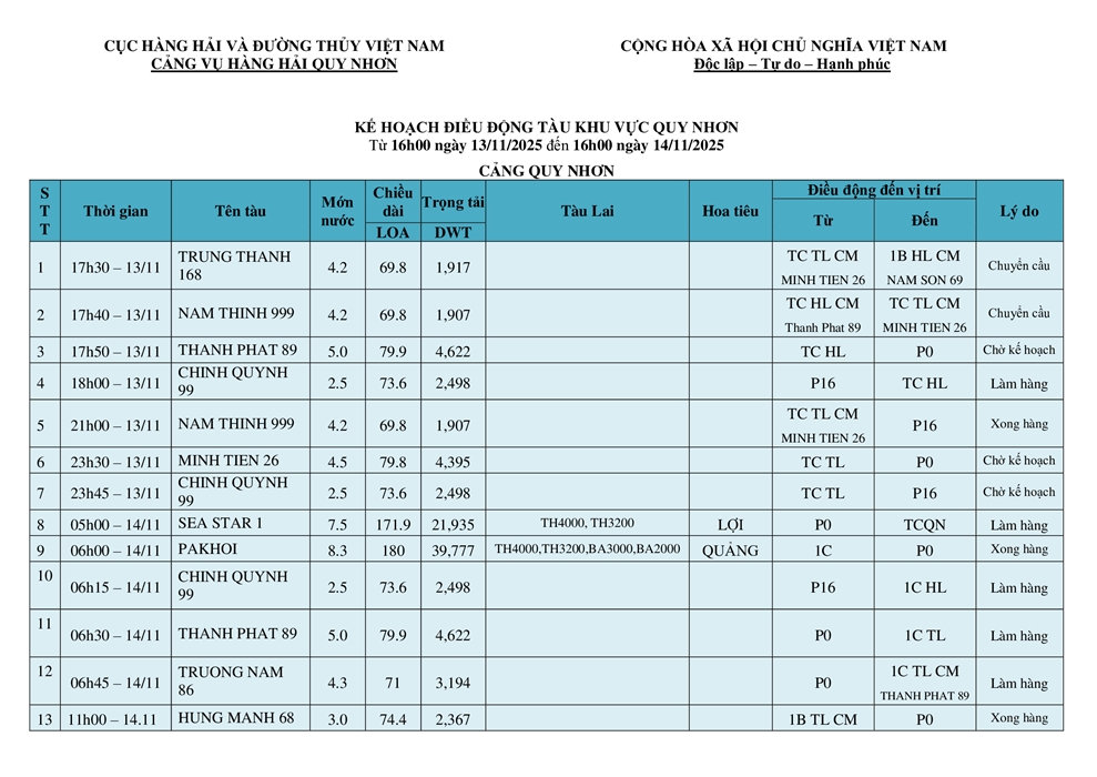 KẾ HOẠCH ĐIỀU ĐỘNG TÀU NGÀY 14/11/2025