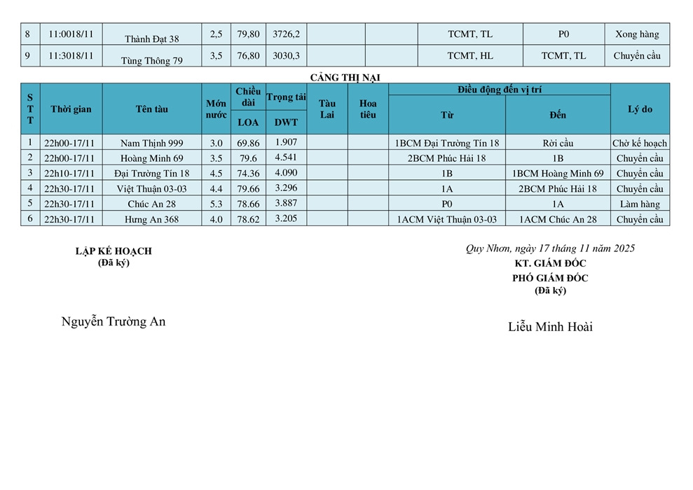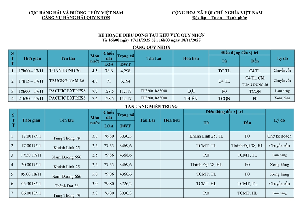 KẾ HOẠCH ĐIỀU ĐỘNG TÀU NGÀY 17/11/2025