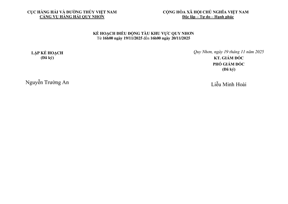 KẾ HOẠCH ĐIỀU ĐỘNG TÀU NGÀY 20/11/2025