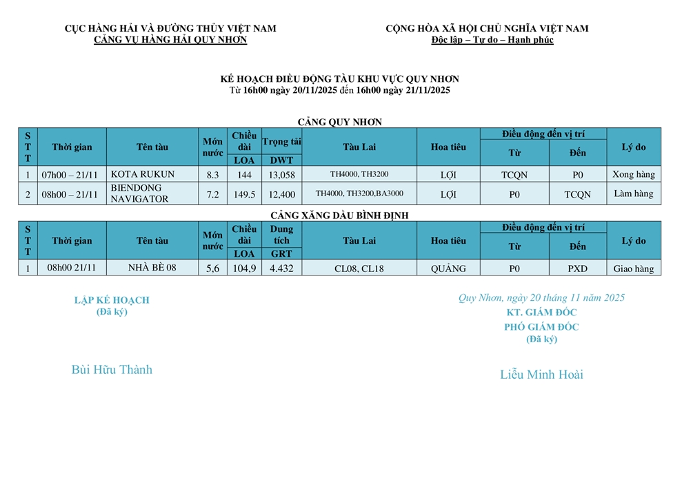 KẾ HOẠCH ĐIỀU ĐỘNG TÀU NGÀY 20/11/2025