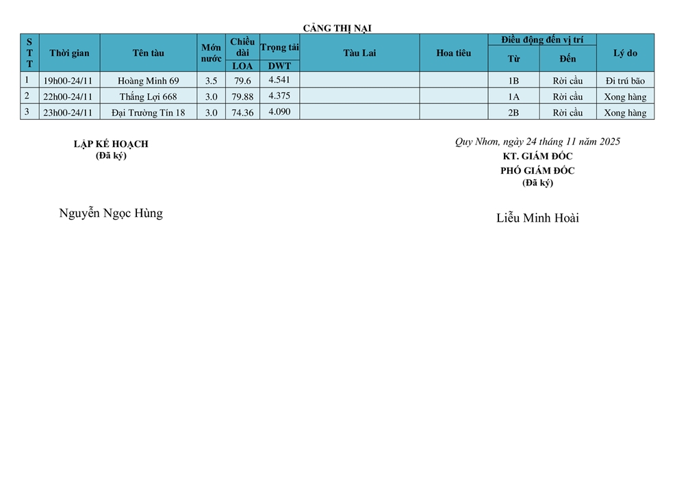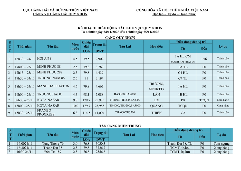 KẾ HOẠCH ĐIỀU ĐỘNG TÀU NGÀY 24/11/2025
