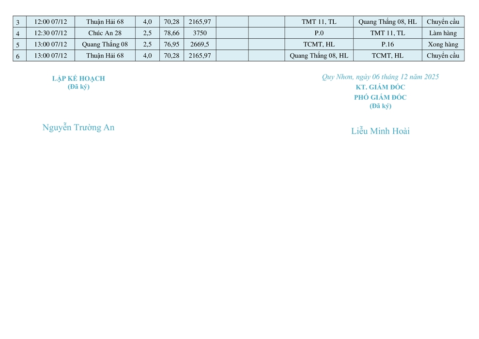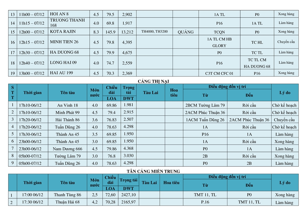 KẾ HOẠCH ĐIỀU ĐỘNG TÀU NGÀY 07/12/2025