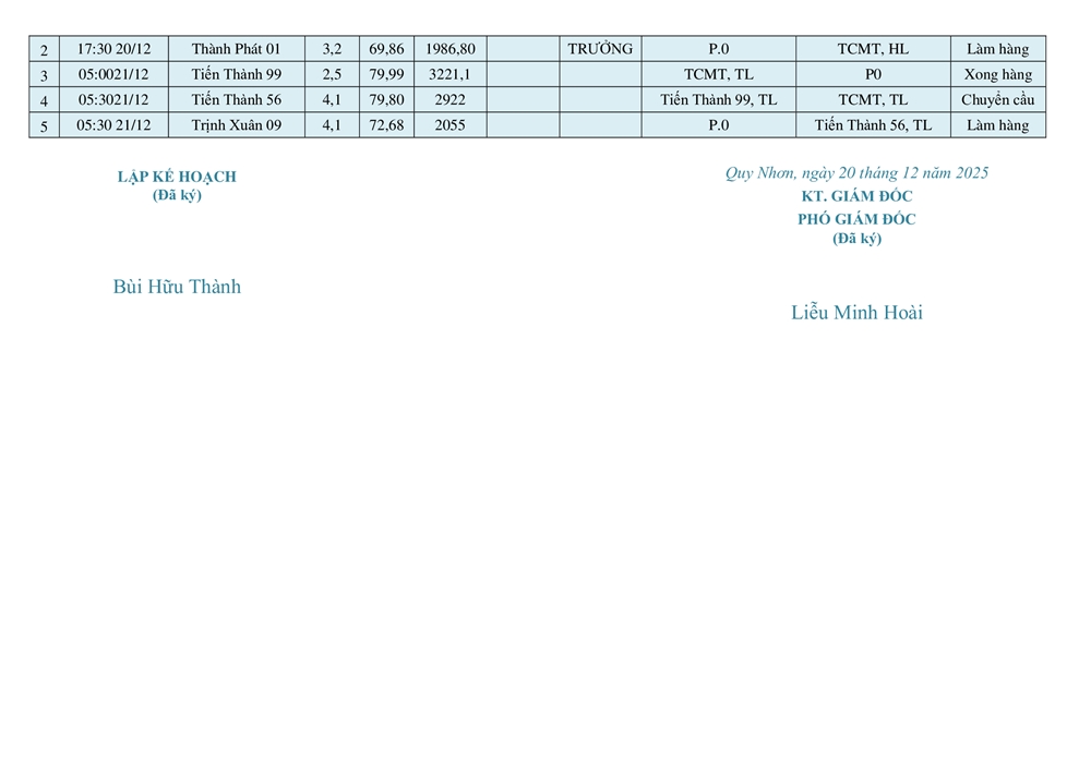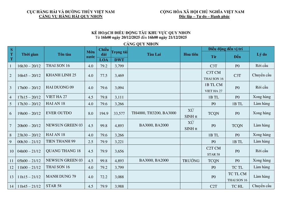 KẾ HOẠCH ĐIỀU ĐỘNG TÀU NGÀY 20/12/2025