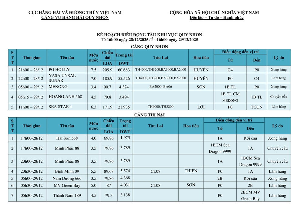 KẾ HOẠCH ĐIỀU ĐỘNG TÀU NGÀY 28/12/2025