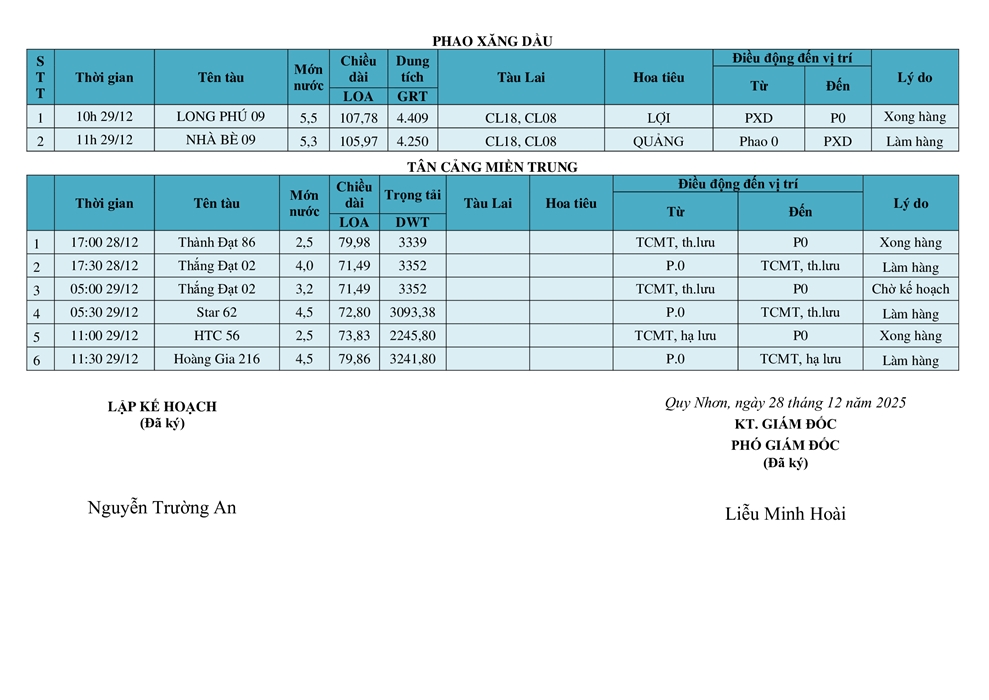 KẾ HOẠCH ĐIỀU ĐỘNG TÀU NGÀY 29/12/2025
