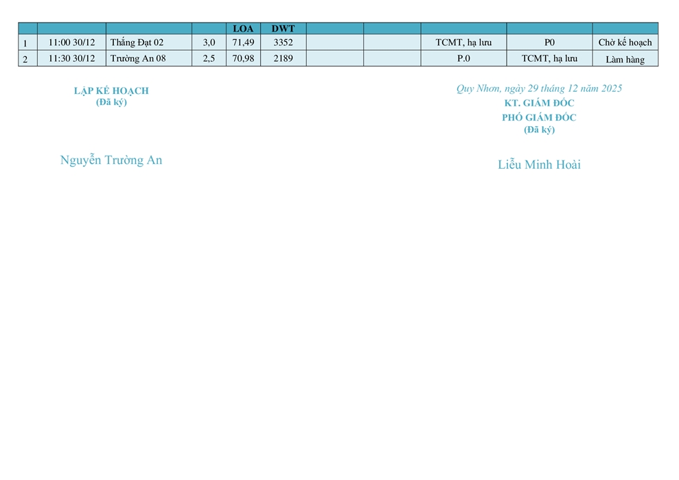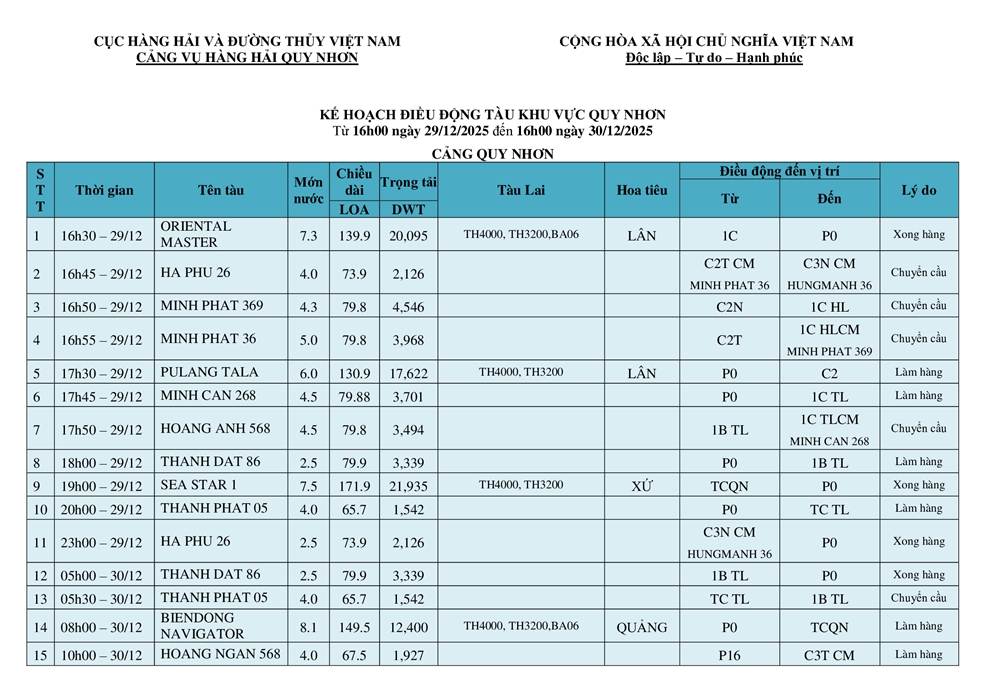KẾ HOẠCH ĐIỀU ĐỘNG TÀU NGÀY 29/12/2025