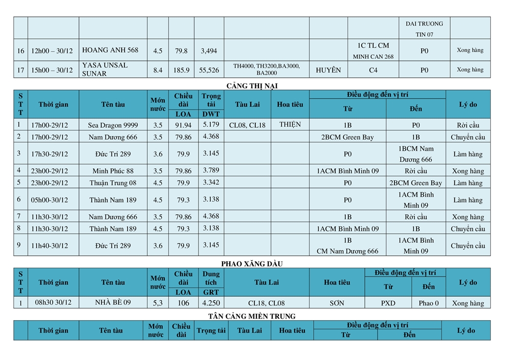 KẾ HOẠCH ĐIỀU ĐỘNG TÀU NGÀY 30/12/2025