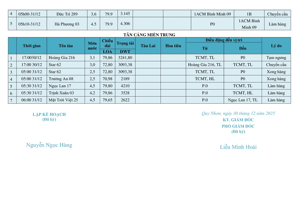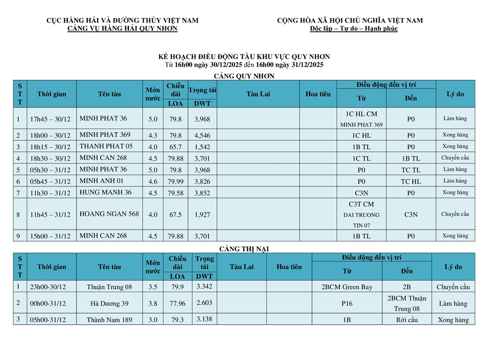 KẾ HOẠCH ĐIỀU ĐỘNG TÀU NGÀY 30/12/2025