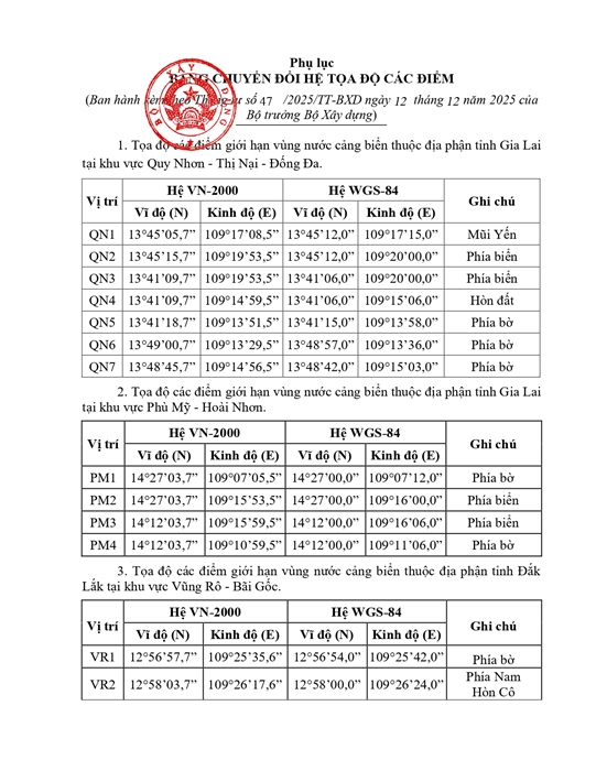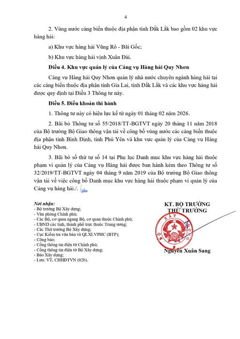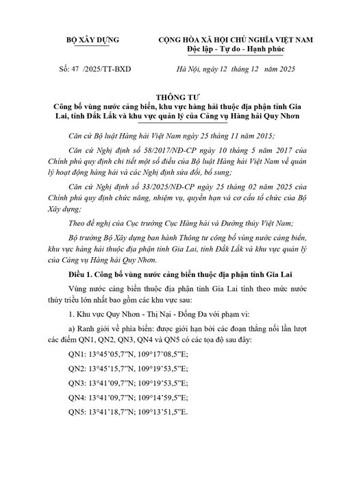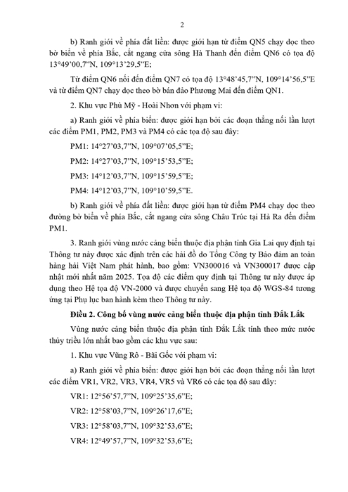 THÔNG TƯ Công bố vùng nước cảng biển, khu vực hàng hải thuộc địa phận tỉnh Gia Lai, tỉnh Đắk Lắk và khu vực quản lý của Cảng vụ Hàng hải Quy Nhơn