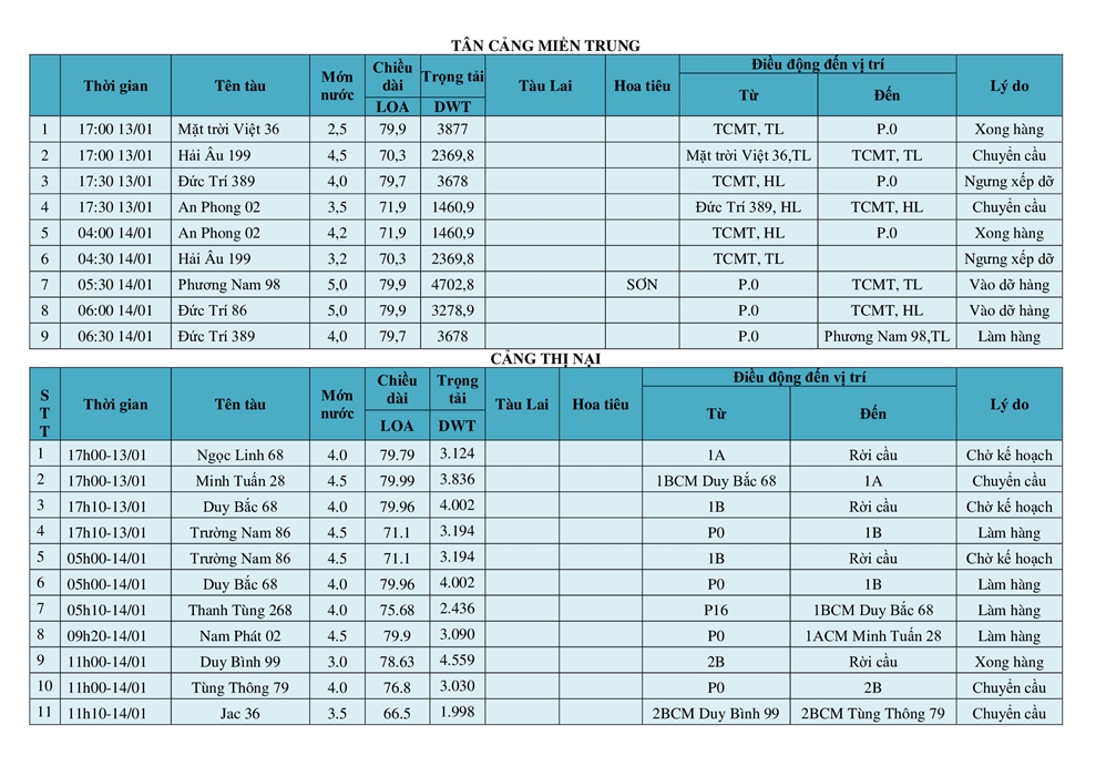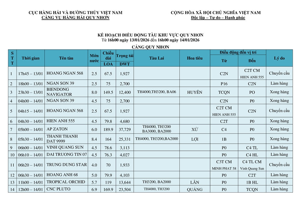 KẾ HOẠCH ĐIỀU ĐỘNG TÀU NGÀY 14/01/2026
