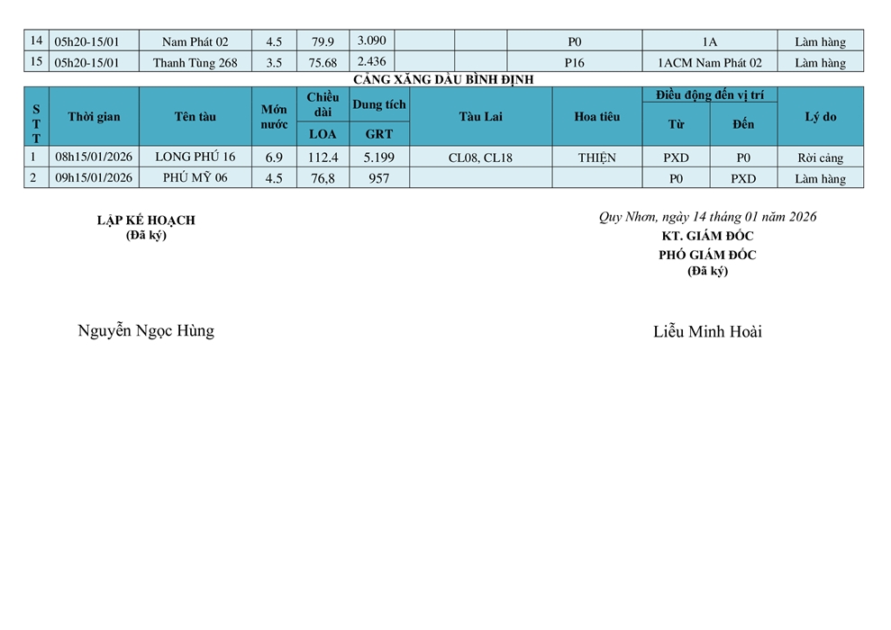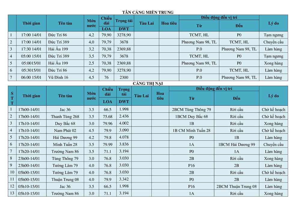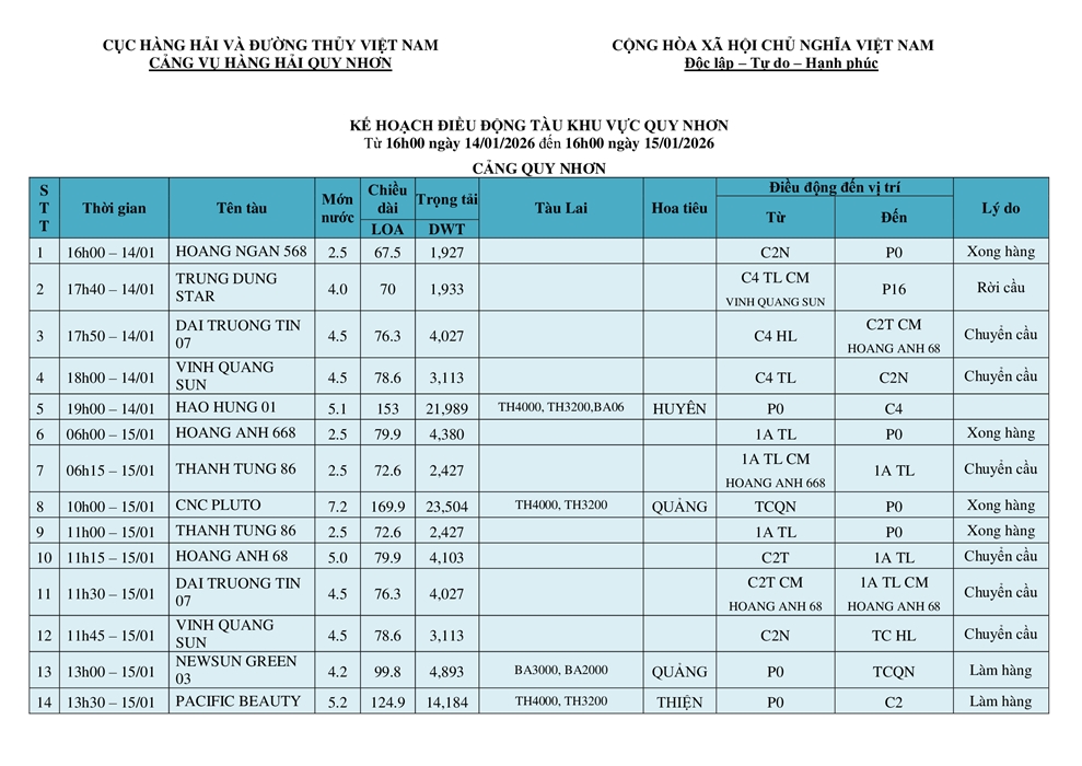 KẾ HOẠCH ĐIỀU ĐỘNG TÀU NGÀY 15/01/2026