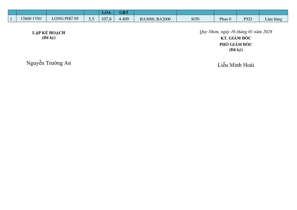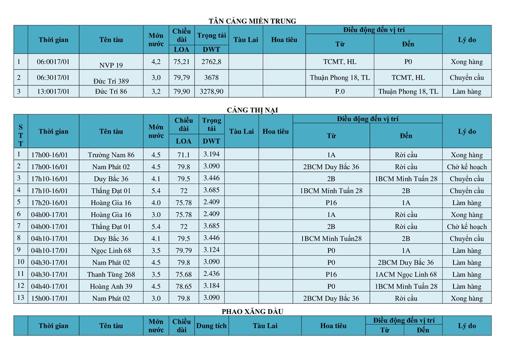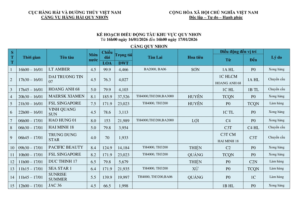 KẾ HOẠCH ĐIỀU ĐỘNG TÀU NGÀY 17/01/2026