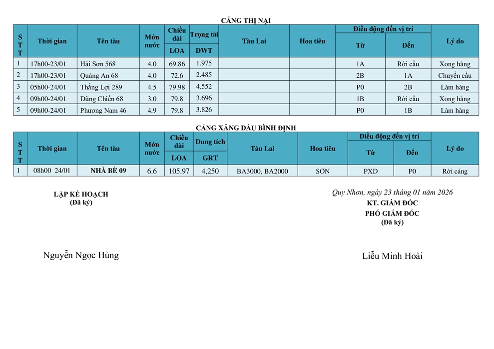 KẾ HOẠCH ĐIỀU ĐỘNG TÀU NGÀY 24/01/2026