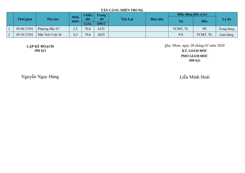 KẾ HOẠCH ĐIỀU ĐỘNG TÀU NGÀY 26/01/2026