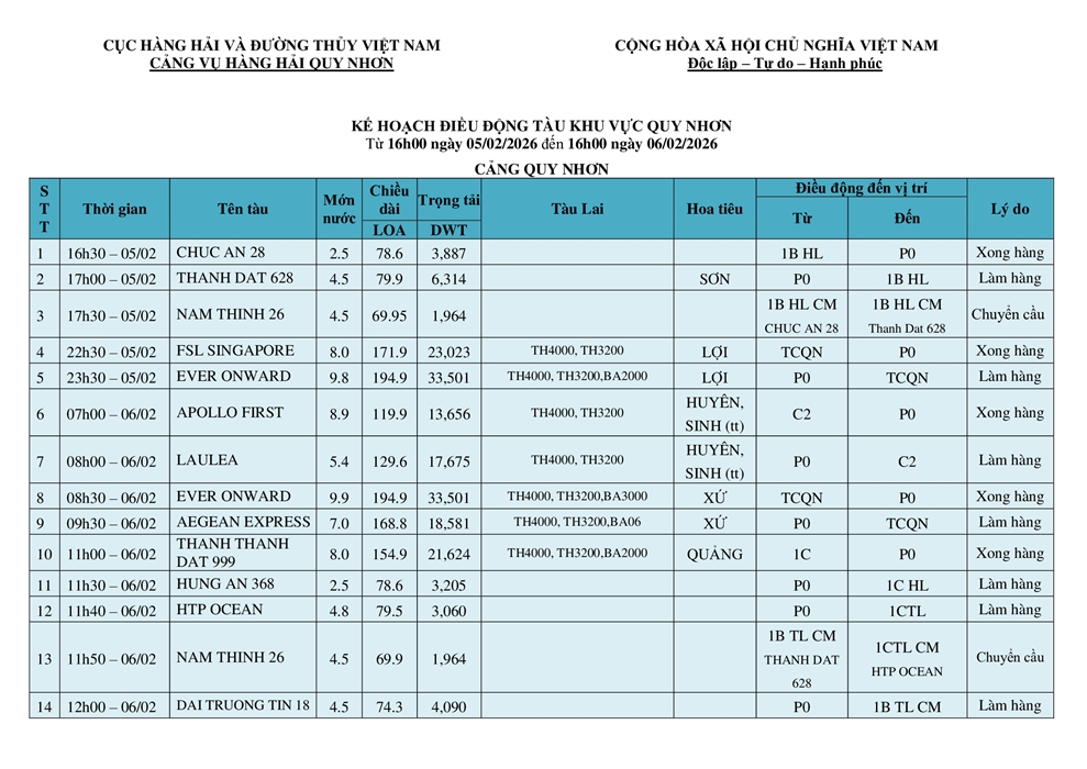KẾ HOẠCH ĐIỀU ĐỘNG TÀU NGÀY 05/02/2026