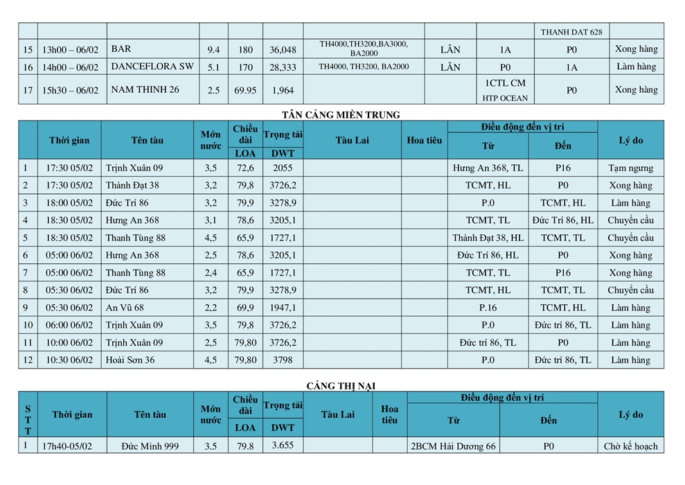 KẾ HOẠCH ĐIỀU ĐỘNG TÀU NGÀY 06/02/2026