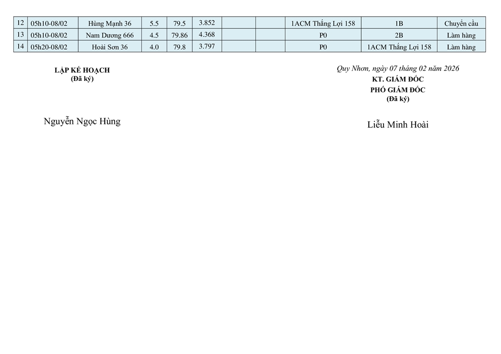 KẾ HOẠCH ĐIỀU ĐỘNG TÀU NGÀY 07/02/2026