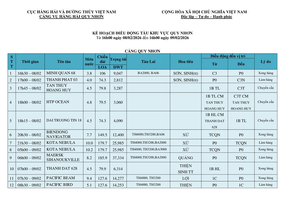 KẾ HOẠCH ĐIỀU ĐỘNG TÀU NGÀY 08/02/2026